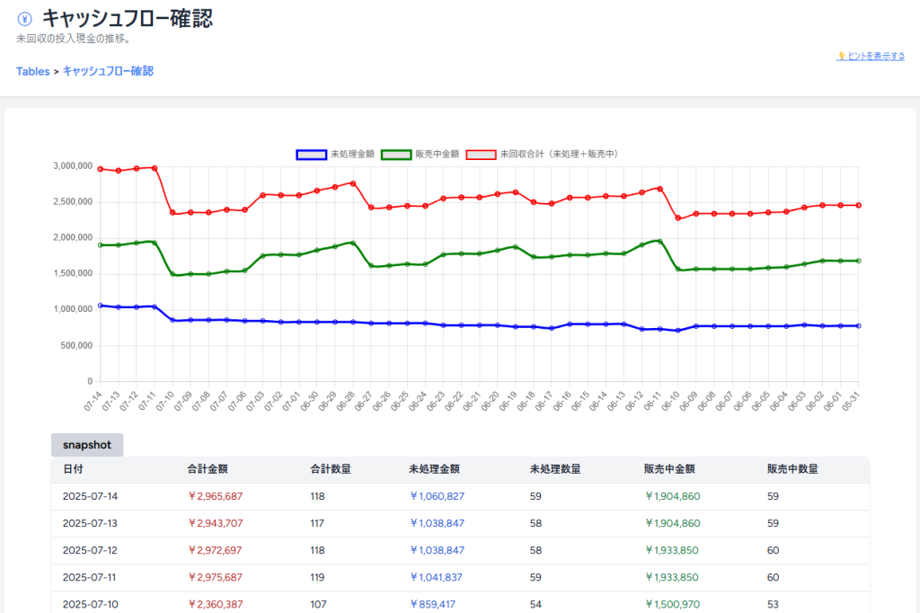 | 合計金額 | 未処理金額+販売中金額の合計(投資資金の未回収総額) |