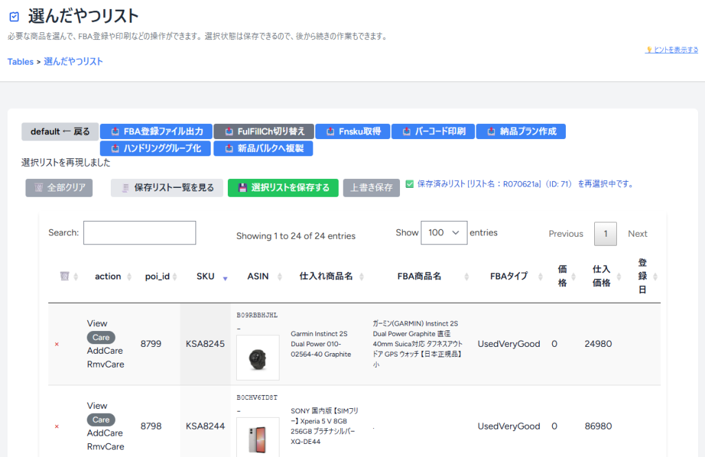 「選んだやつリスト」は、FBA納品登録やバーコード印刷などの作業をまとめて行うための一時的な選択リストです。
